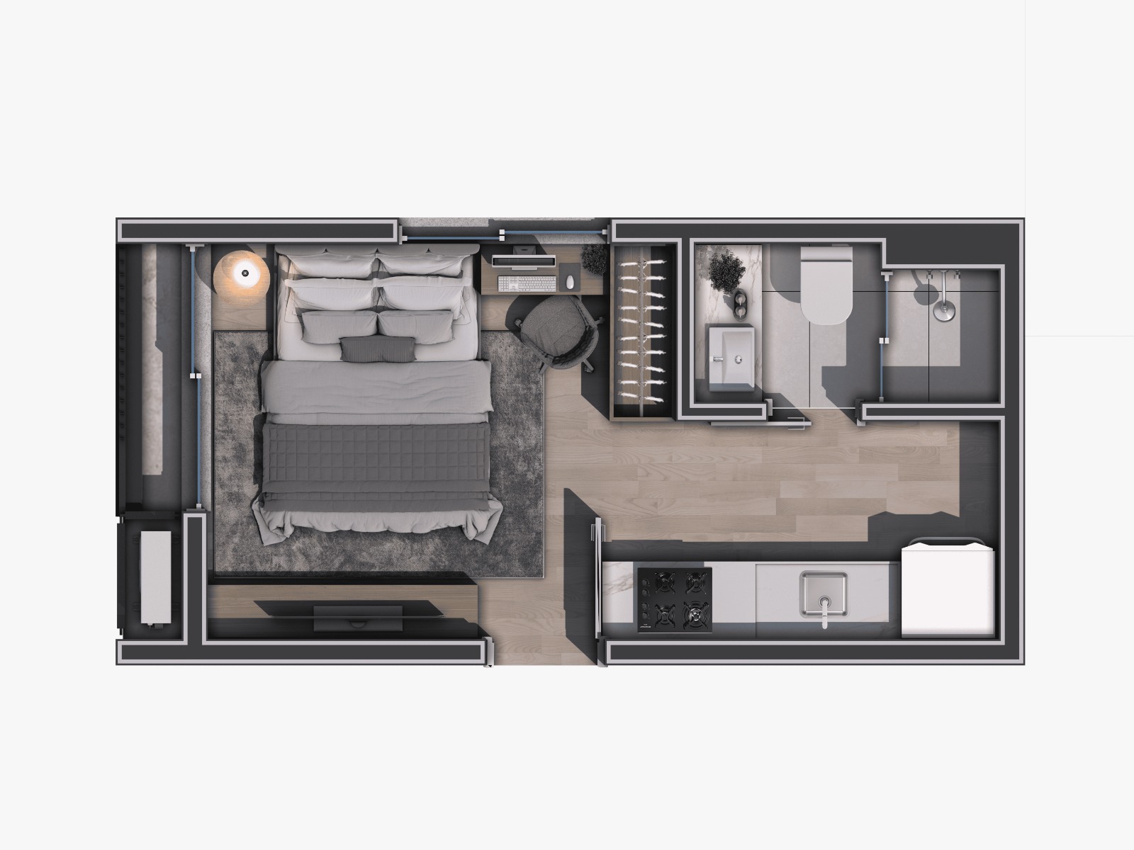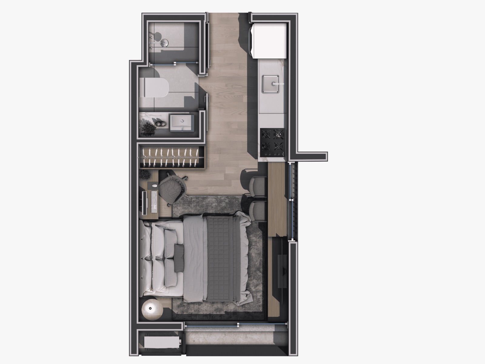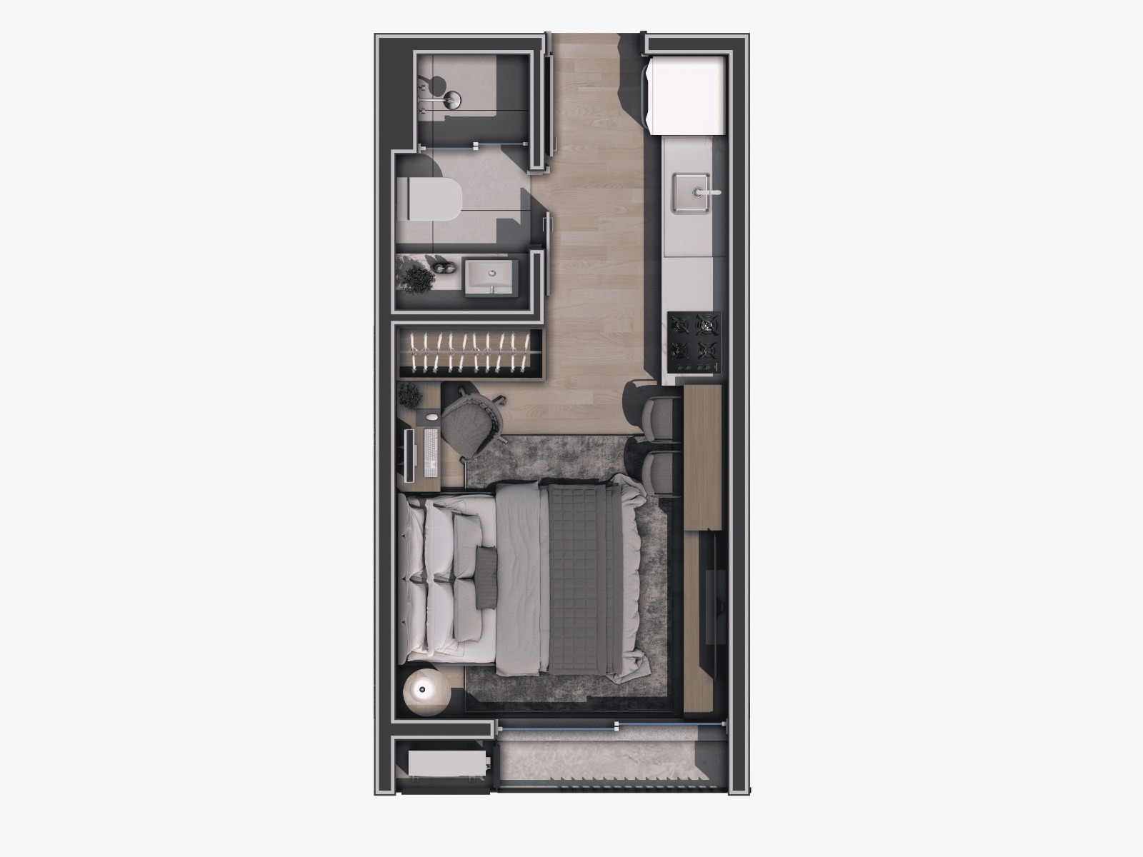 Studios a partir de 22.78m² de área privativa com sacada. Formato perfeito para estudantes, profissionais e locação de temporada.